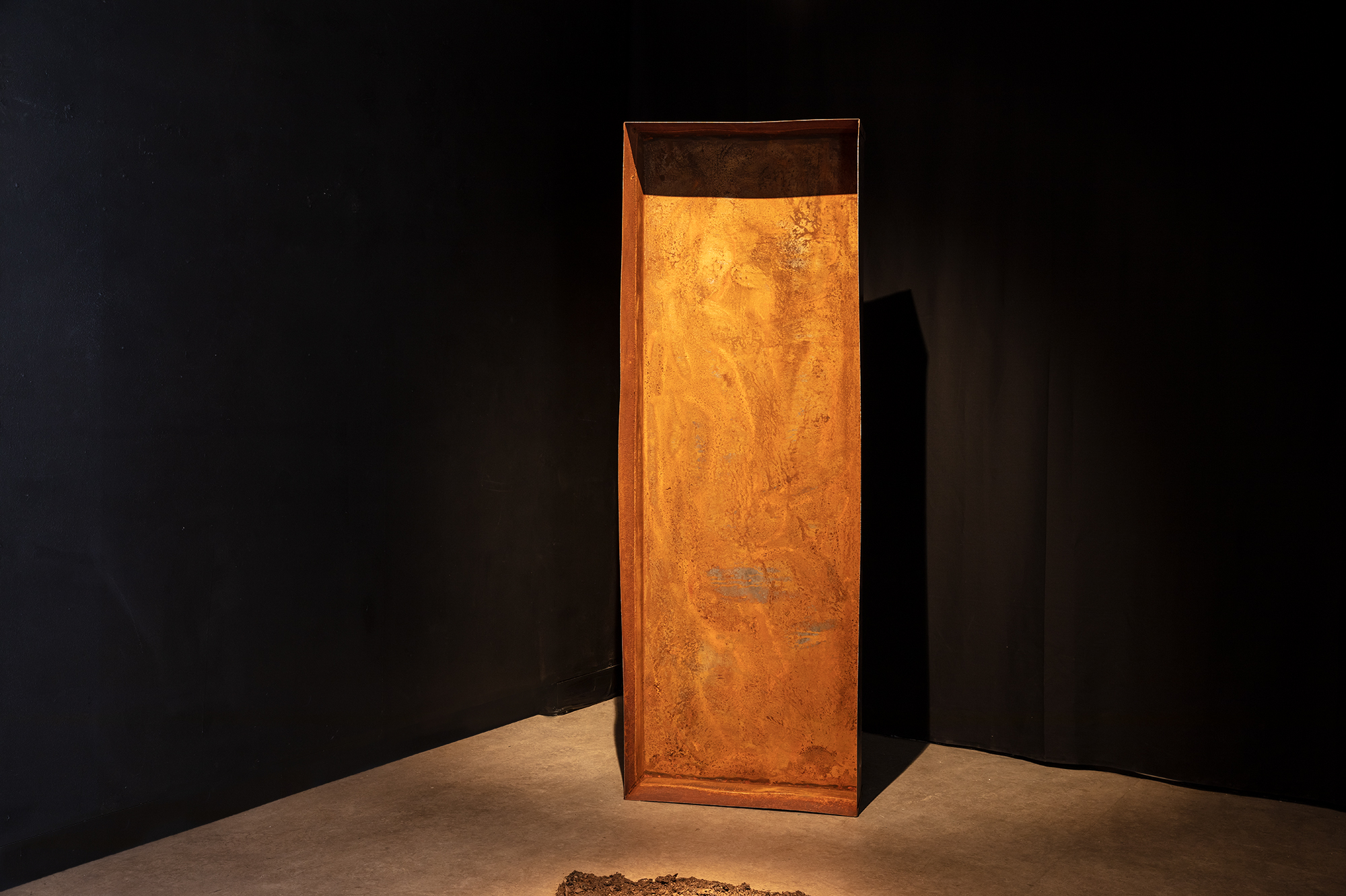 En öppning inåt och en nedåt. Installationen Öppningar visades i utställningen Inunder med konstnärsgruppen Verkligheten på TEGEN2 i Stockholm. Den består av verken Port och Bädd. Stående i rummet blir stålkaret en dörröppning, och då den består av plåt resonerar den med de ljud som finns i rummet, som om den vore en mynning till en grotta. Verket Bädd har samma dimensioner som Port och ligger som en skugga av jord på golvet. Jorden är inkorporerad i silikon, vilket skapar ett solitt täcke eller ett lock som skiljer rummet från det som finns där under.Foto: Fanny Carinasdotter