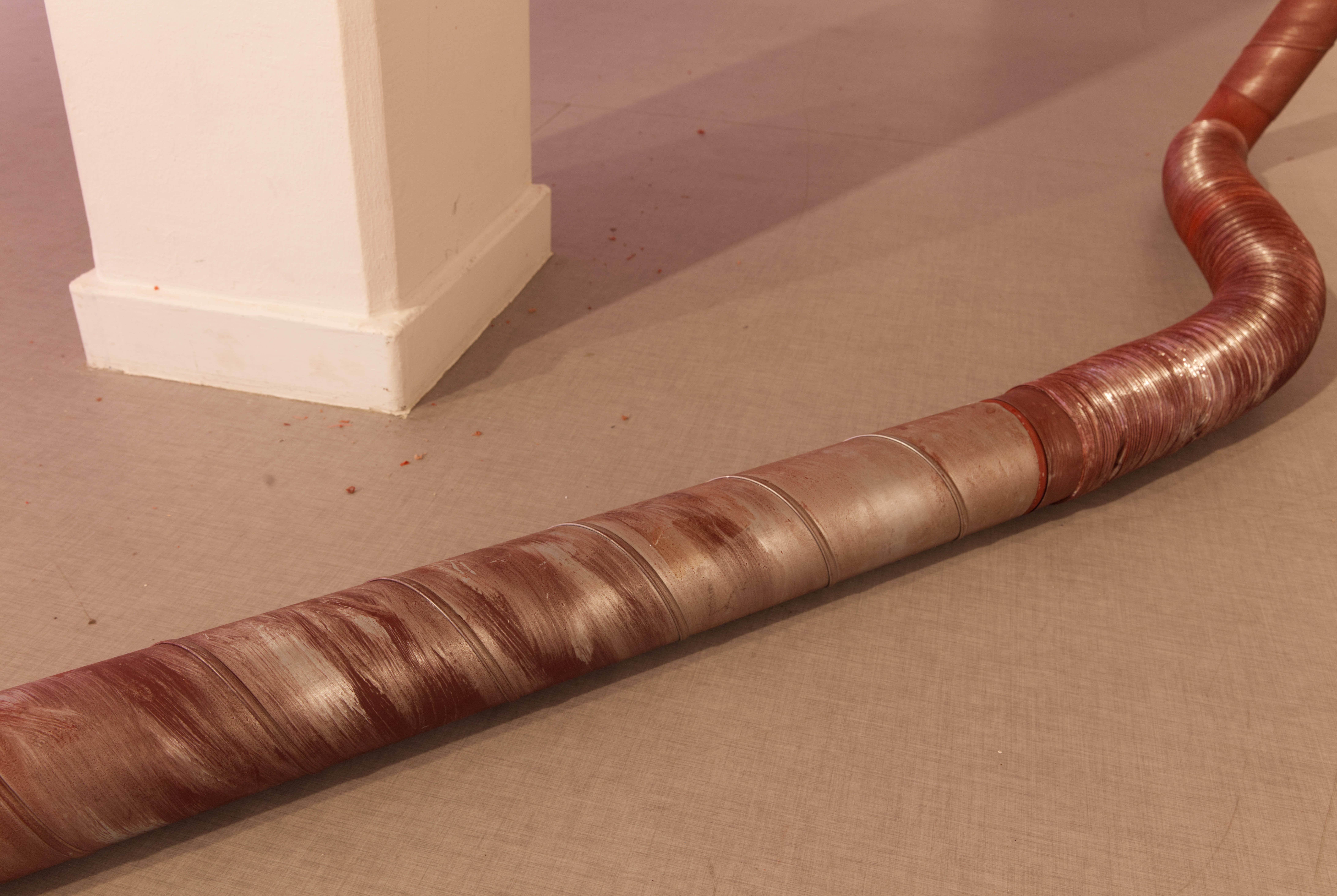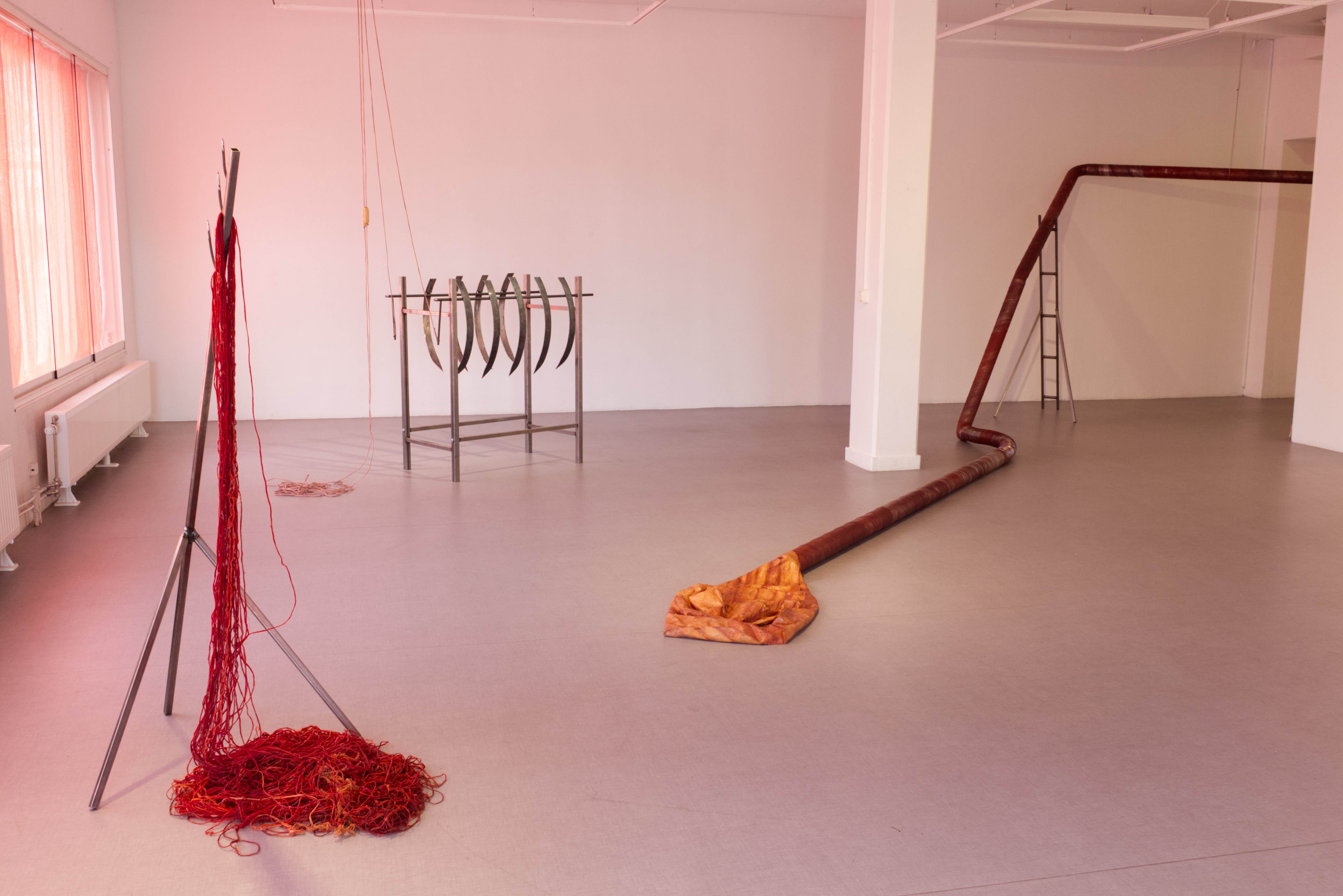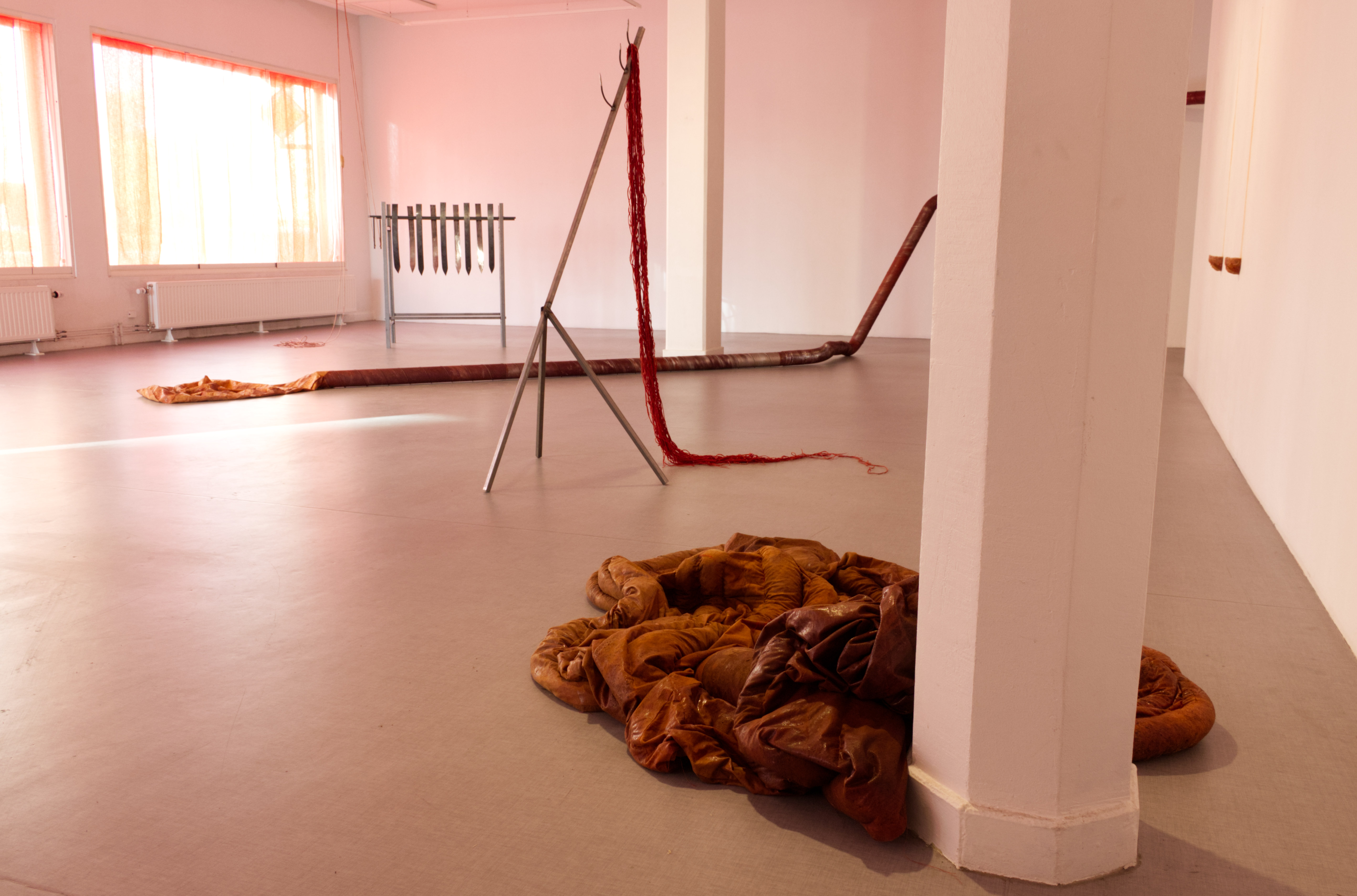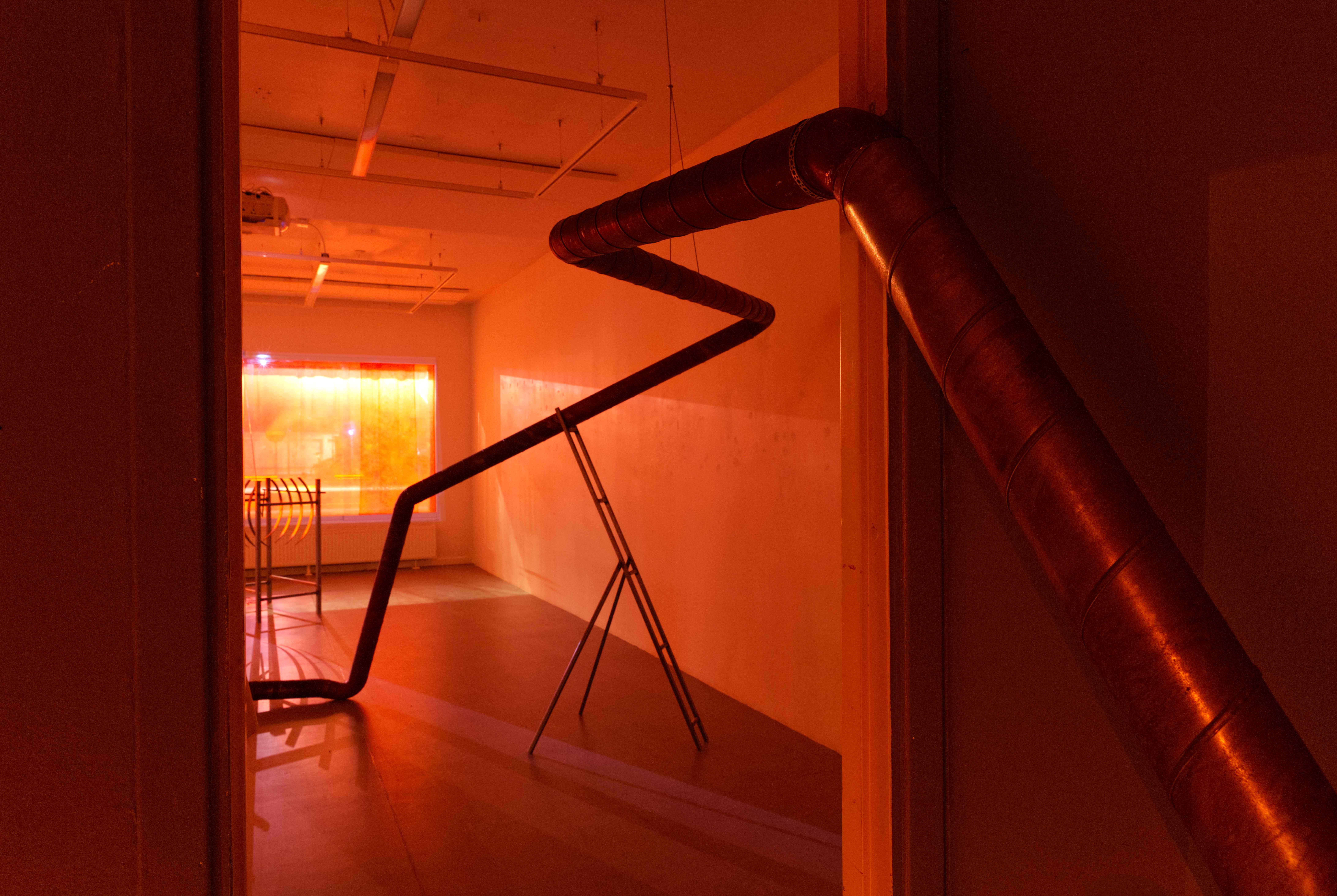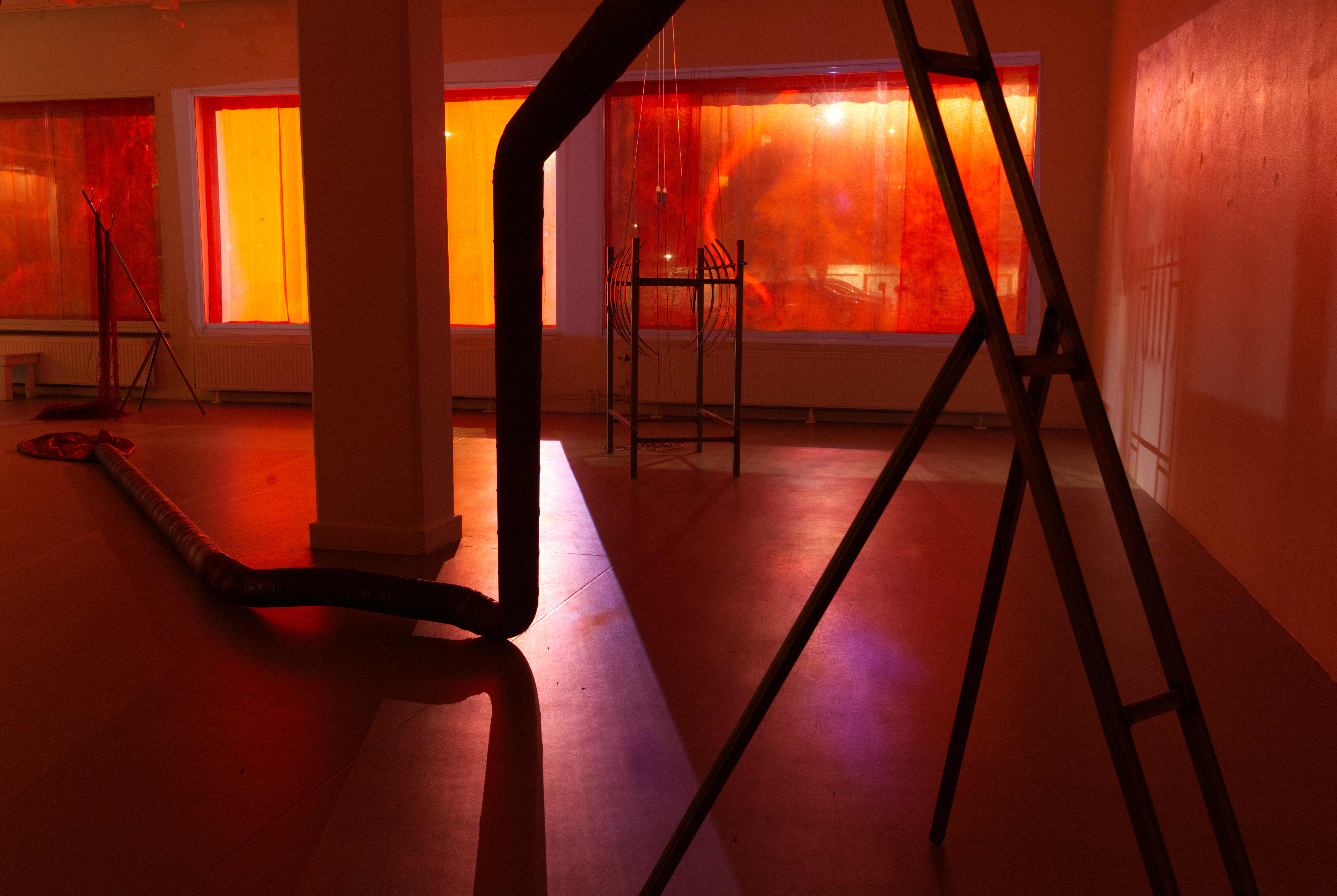 Nattetid syntes projektioner med olika flöden i galleriets fönster; en järnrik bäck, rostig vätska och rep som cirkulerar (från mitt tidigare verk Repmaskin). Genom videorna ville jag levandegöra gallerirummet utanför öppettiderna. Filmerna kopplar an till pågående rörelser i kroppen, och samspelar med flödet av passerande bilar och människor utanför. Projektionerna reflekteras även på väggarna inne i galleriet och fyller rummet med ett rött ljus.
