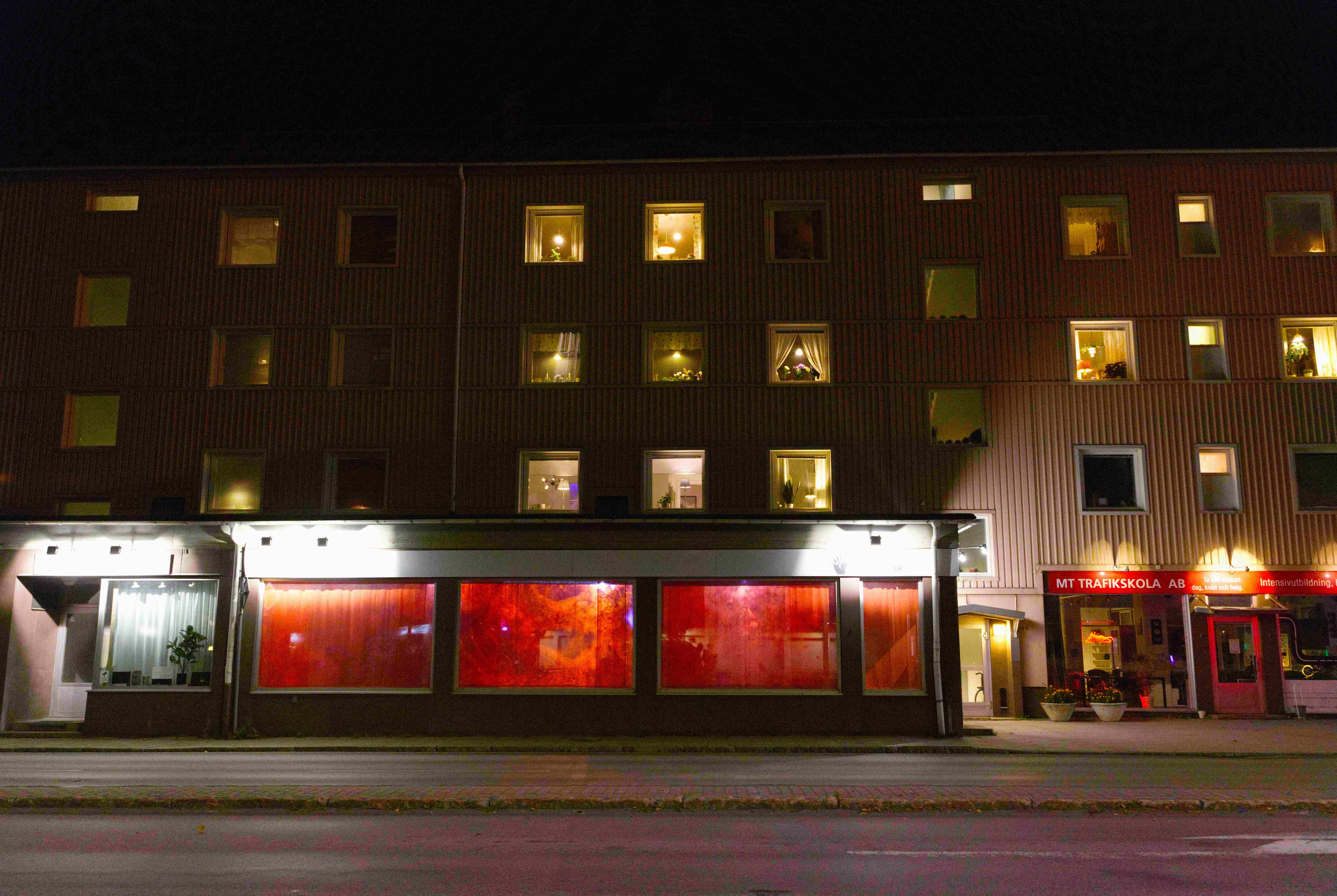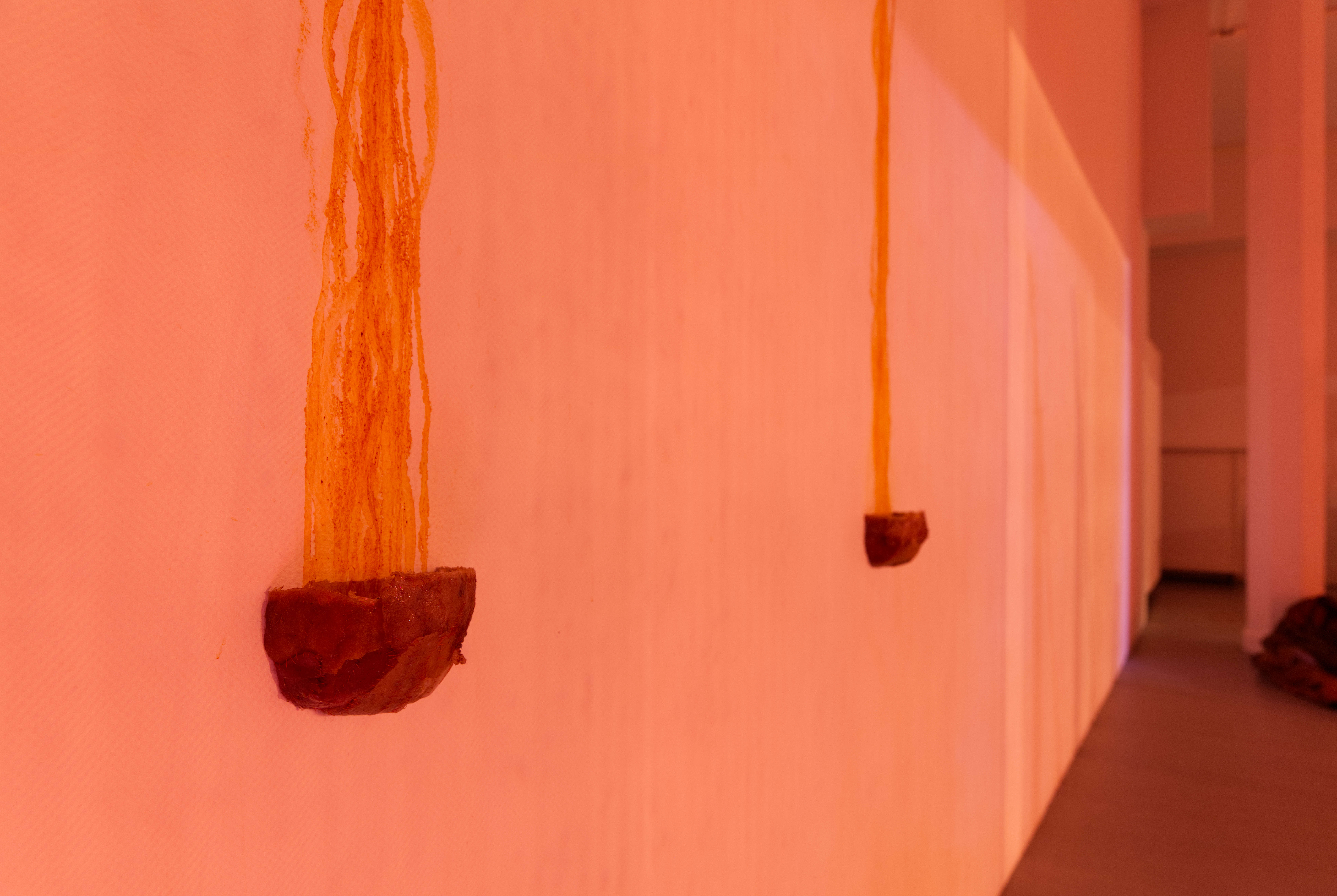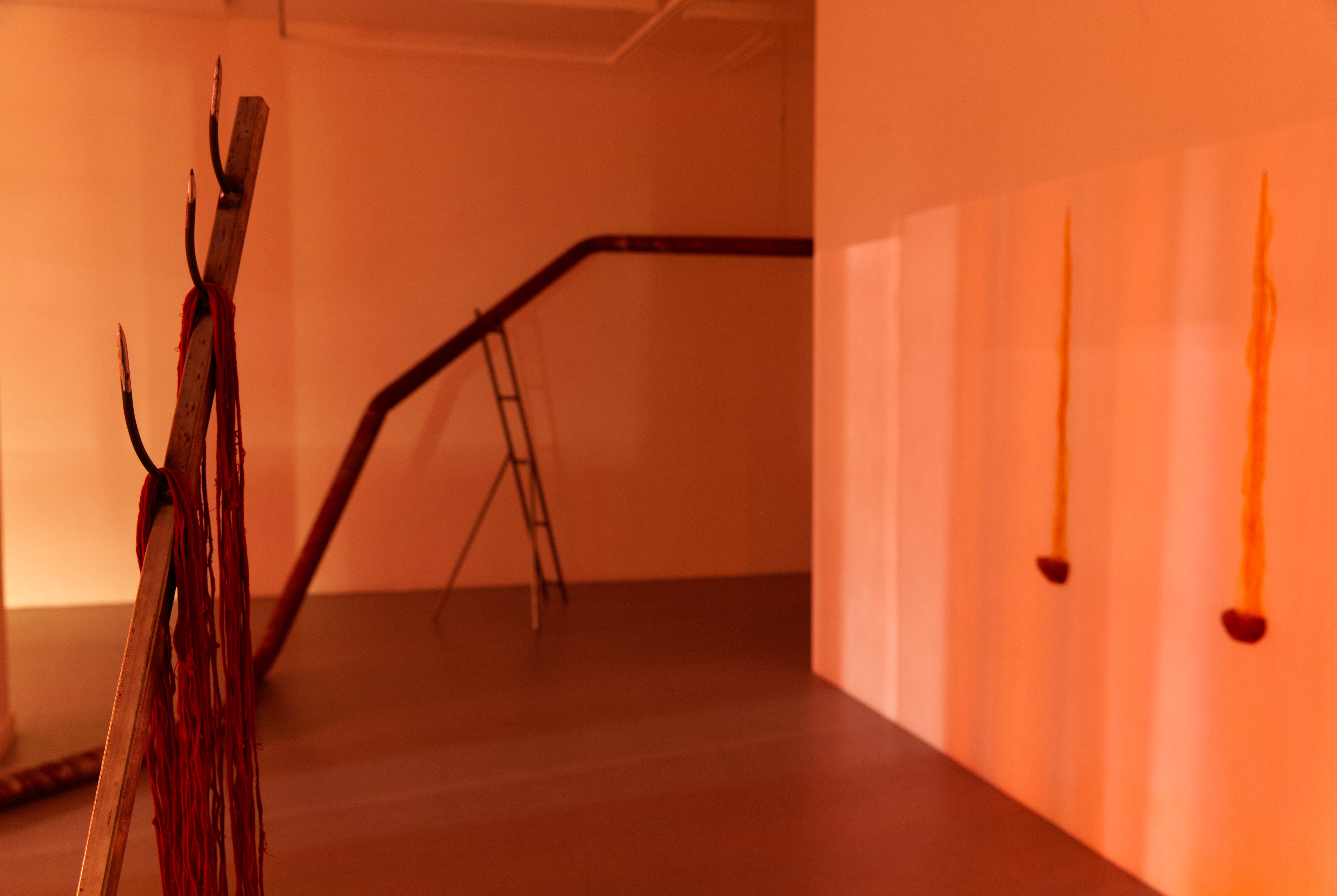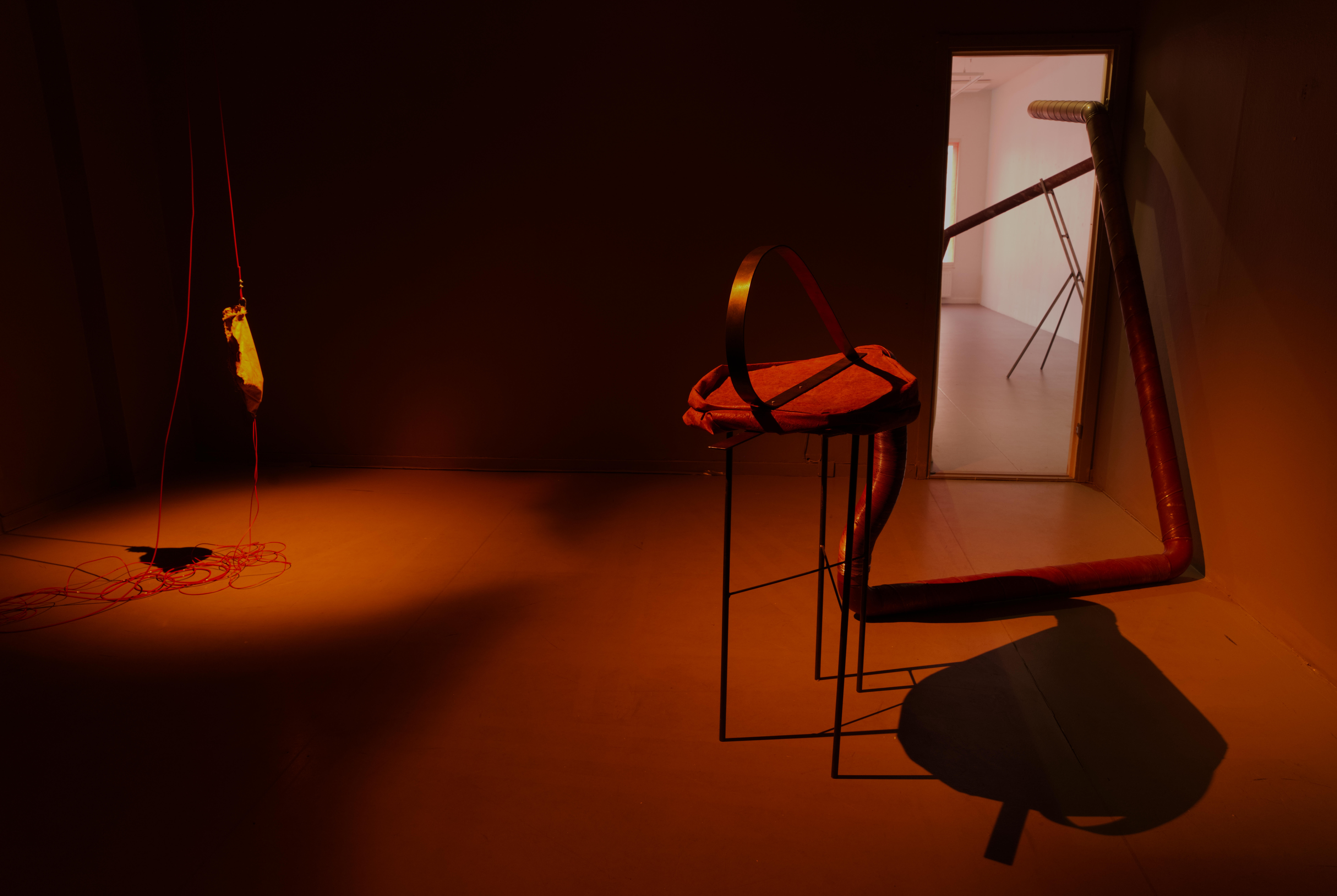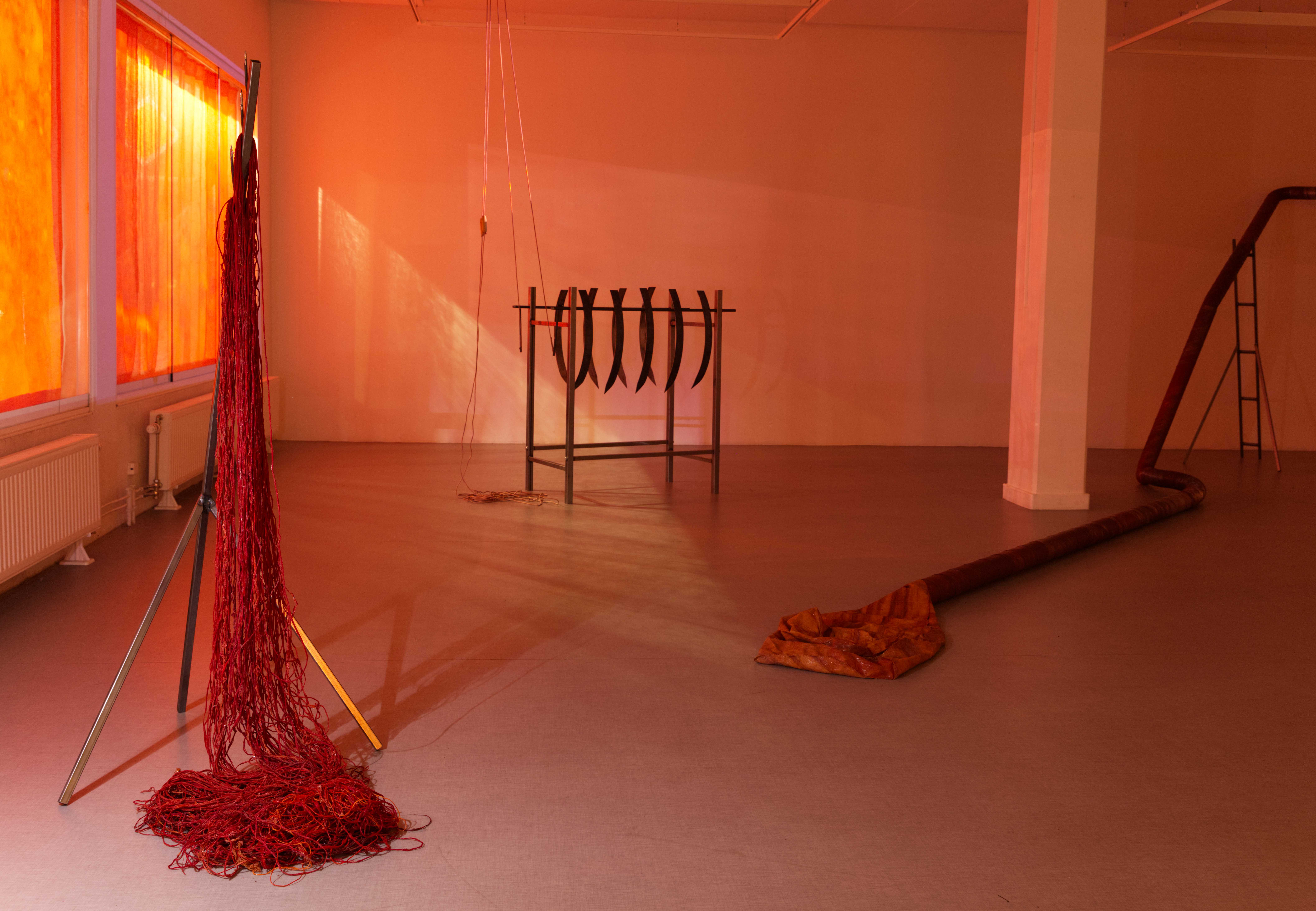 Nattetid syntes projektioner med olika flöden i galleriets fönster; en järnrik bäck, rostig vätska och rep som cirkulerar (från mitt tidigare verk Repmaskin). Genom videorna ville jag levandegöra gallerirummet utanför öppettiderna. Filmerna kopplar an till pågående rörelser i kroppen, och samspelar med flödet av passerande bilar och människor utanför. Projektionerna reflekteras även på väggarna inne i galleriet och fyller rummet med ett rött ljus.